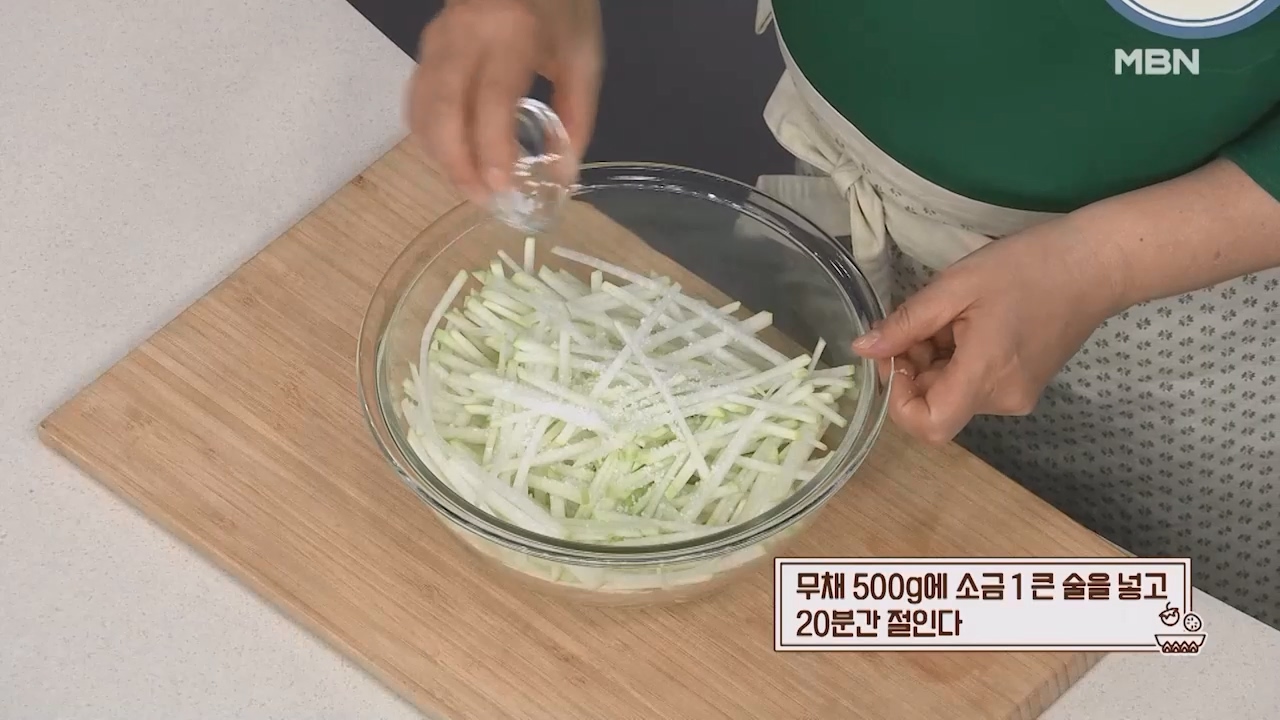 2. 무채 500g에 소금 1큰술을 넣고 20분간 절여줍니다.
