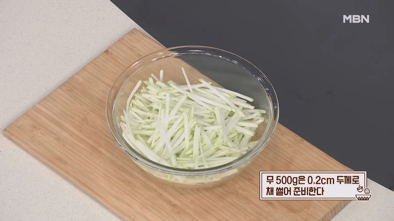1. 무 500g은 0.2cm 두께로 채 썰어 준비합니다.