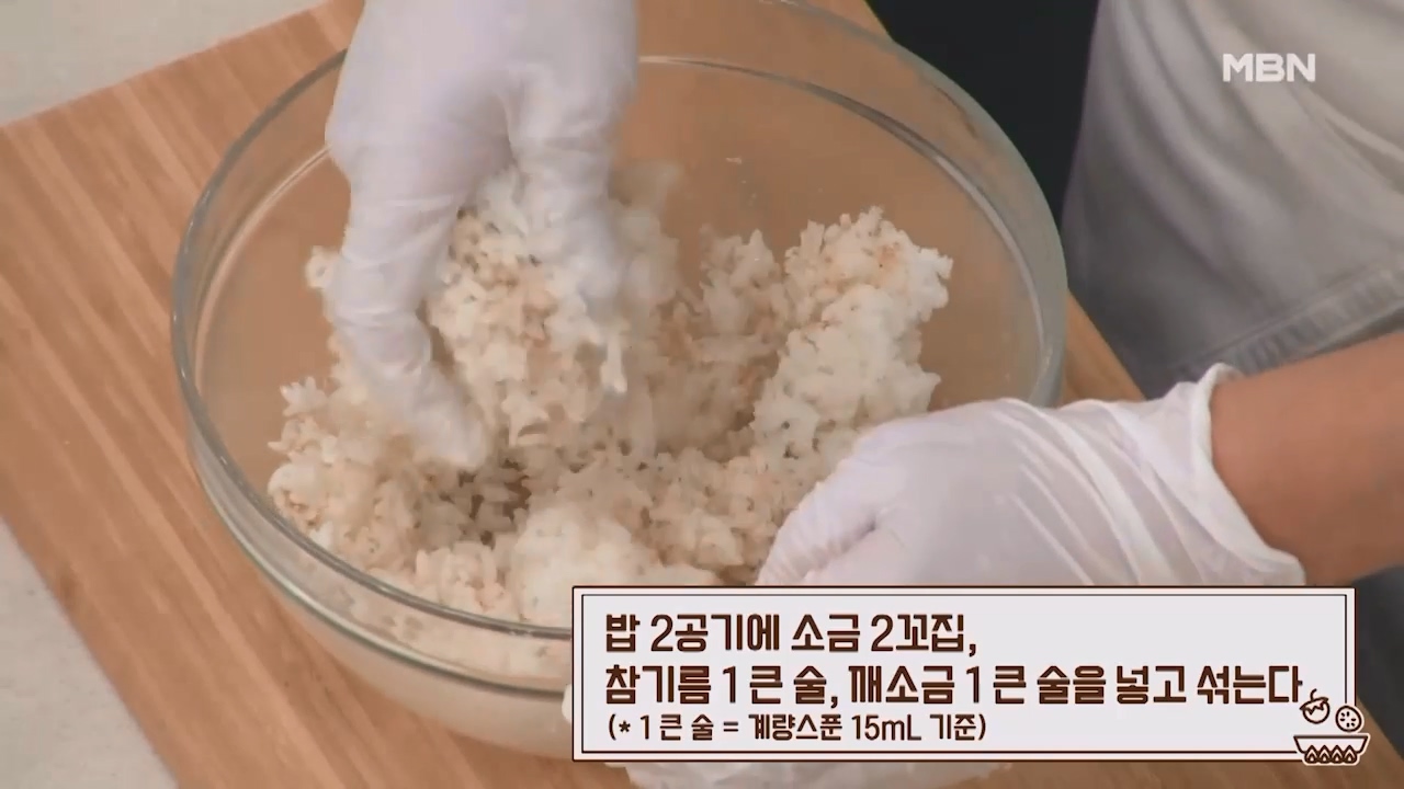 2. 밥 2공기에 소금 2꼬집, 참기름 1큰술, 깨소금 1큰술을 넣고 잘 섞어줍니다. (1큰술은 계량스푼 15mL 기준)