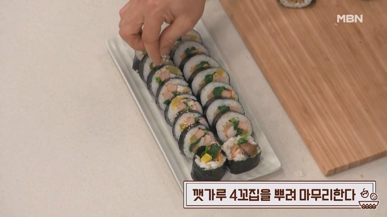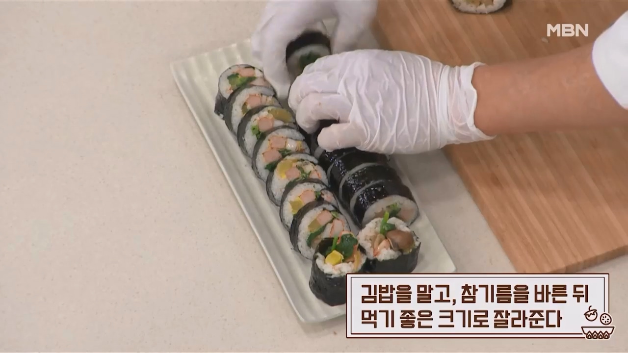 5. 김밥을 말고 참기름을 바른 뒤 먹기 좋은 크기로 잘라줍니다.
