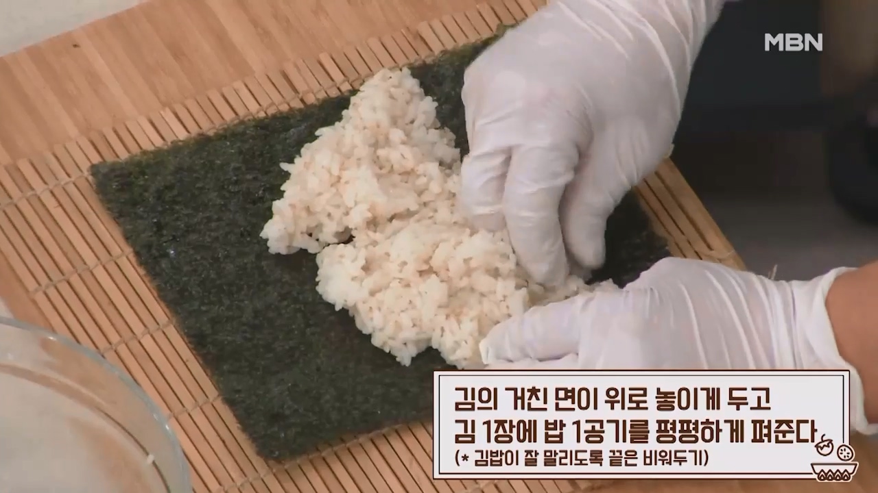 3. 김의 거친 면이 위로 놓이게 두고 김 1장에 밥 1공기를 평평하게 펴줍니다. (김밥이 잘 말리도록 끝은 비워둡니다.)