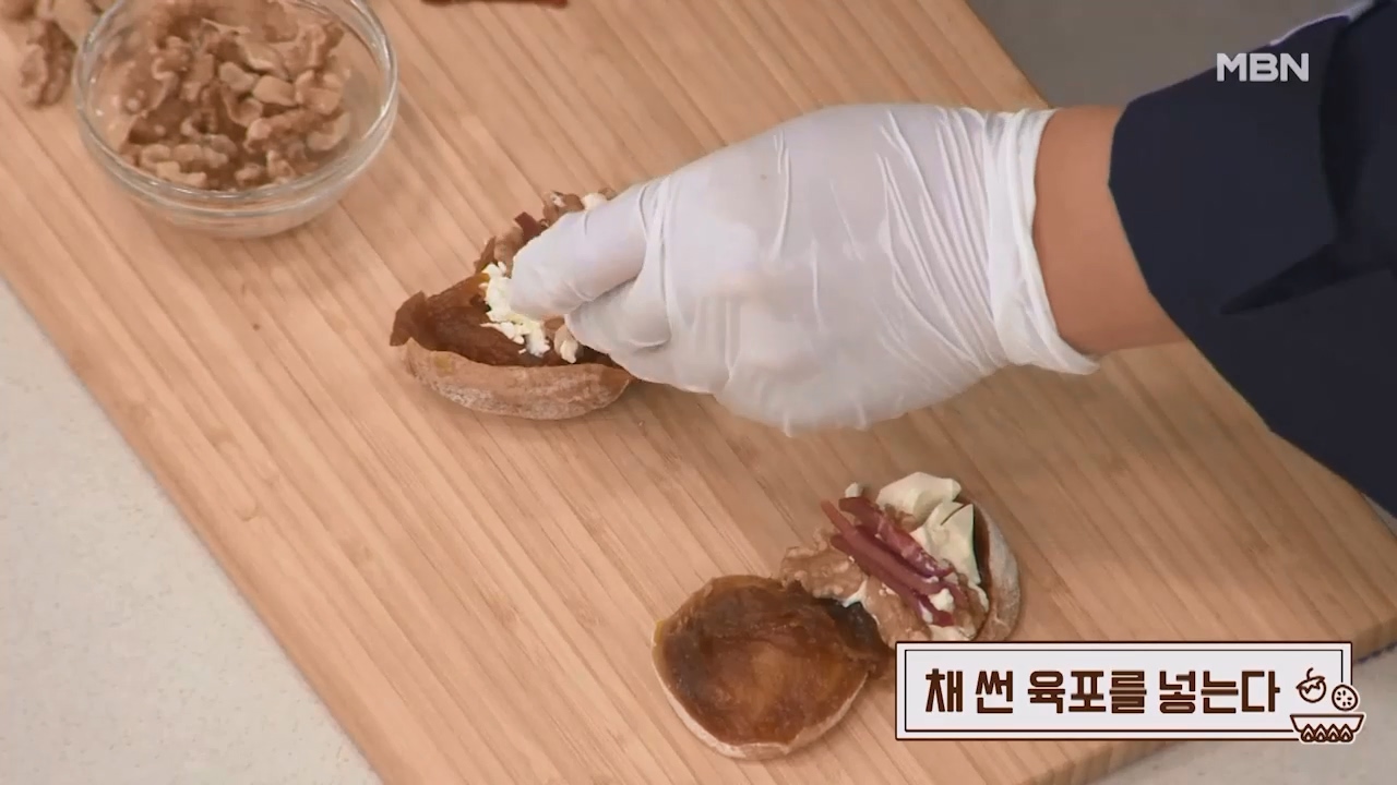 4. 곶감 1개당 크림치즈 1큰술, 호두 2알을 넣어줍니다.