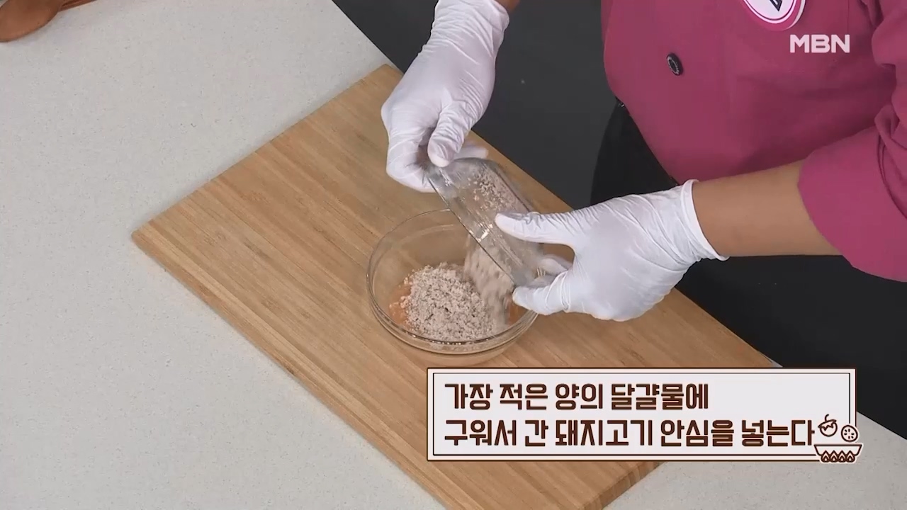 9. 바싹 구운 돼지고기 안심을 분쇄기에 넣고 곱게 갈아줍니다.