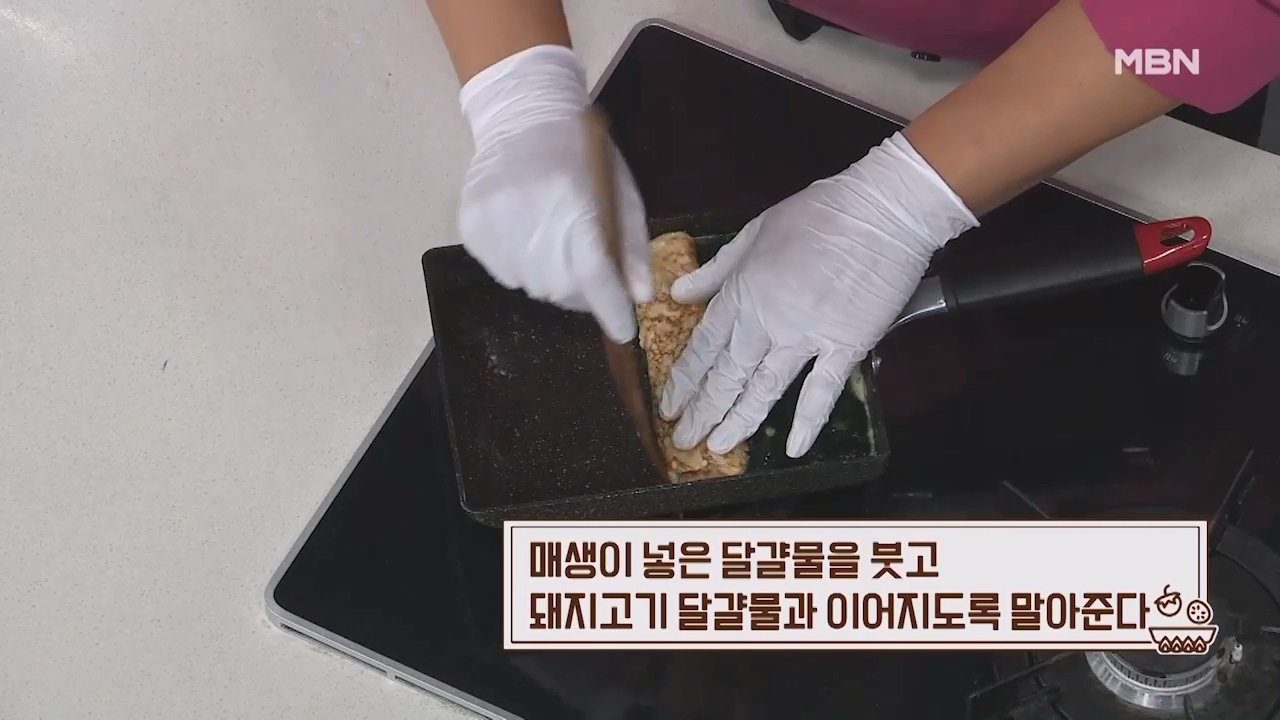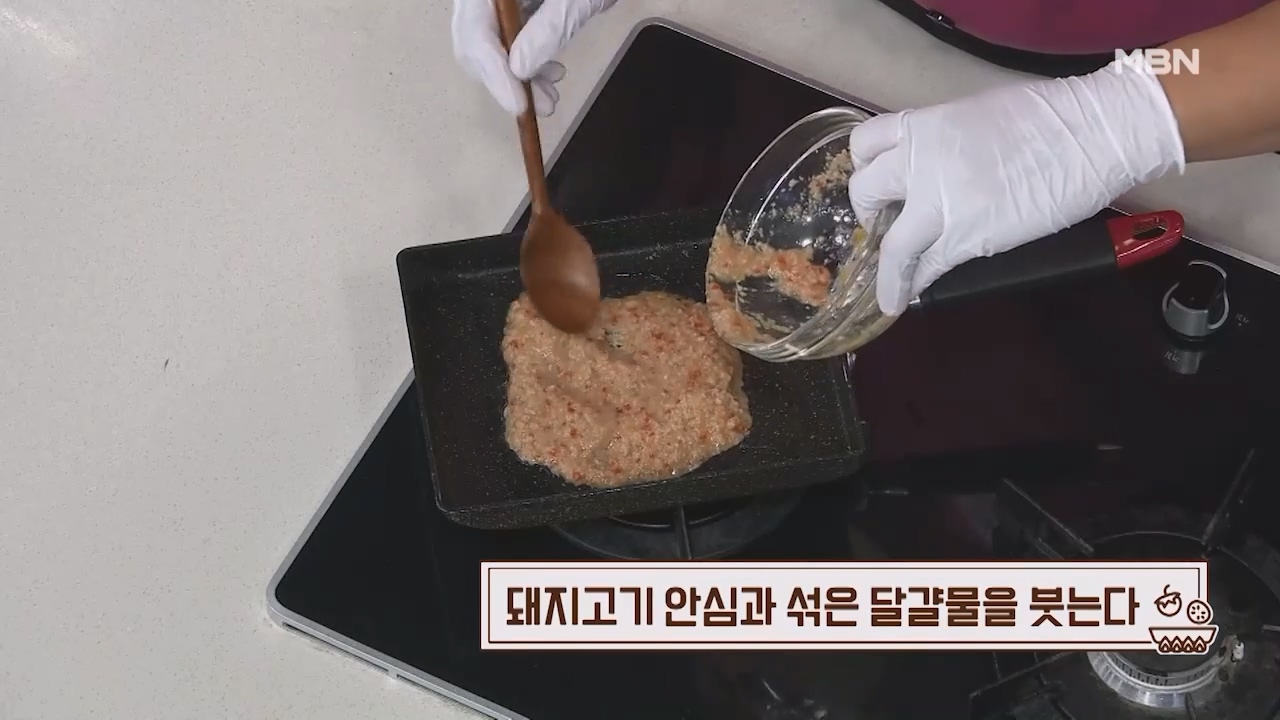 10. 가장 적은 양의 달걀물에 구워서 간 돼지고기 안심을 넣어줍니다.