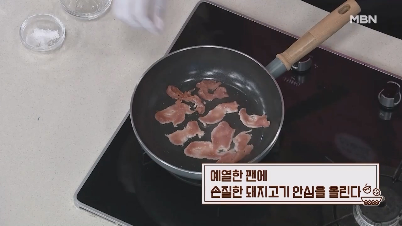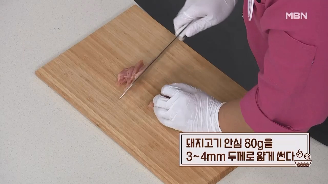 7. 돼지고기 안심 80g을 3~4mm 두께로 얇게 썰어줍니다.