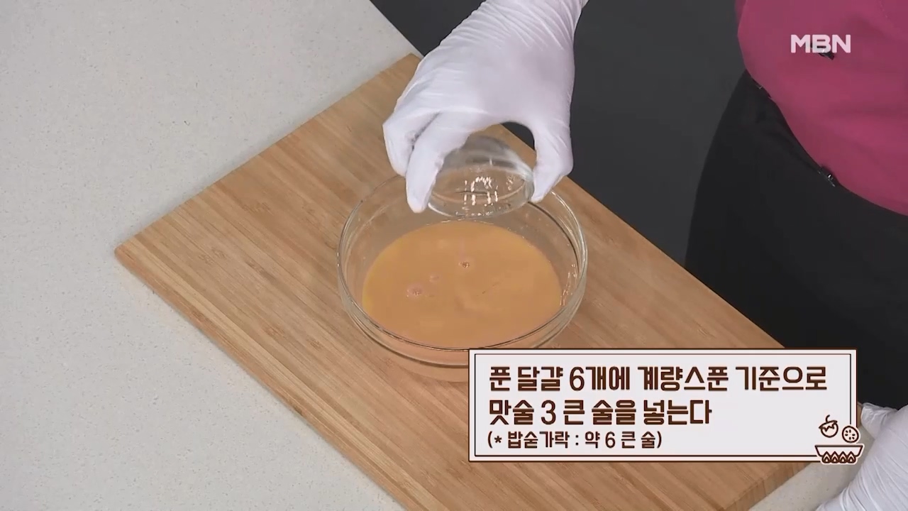 1. 푼 달걀 6개에 계량스푼 기준으로 맛술 3큰술을 넣습니다. (밥숟가락 약 6큰술)