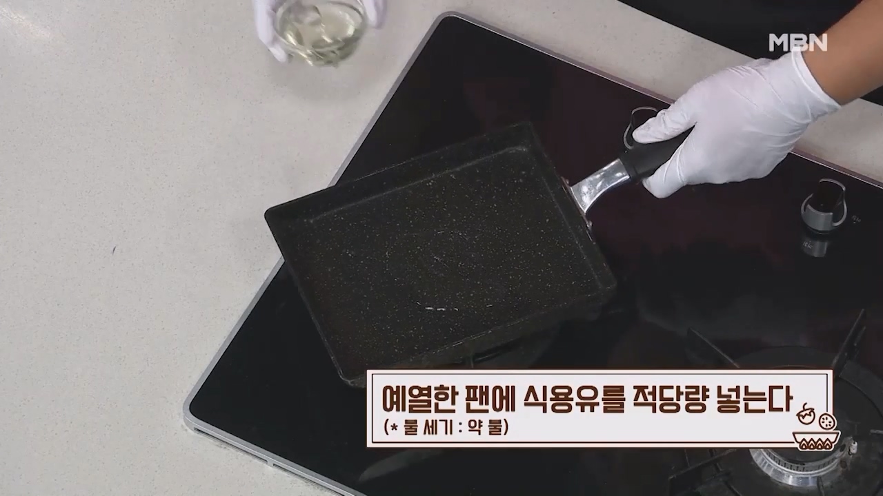 12. 예열한 팬에 식용유를 적당량 넣습니다. (불세기는 약불)
