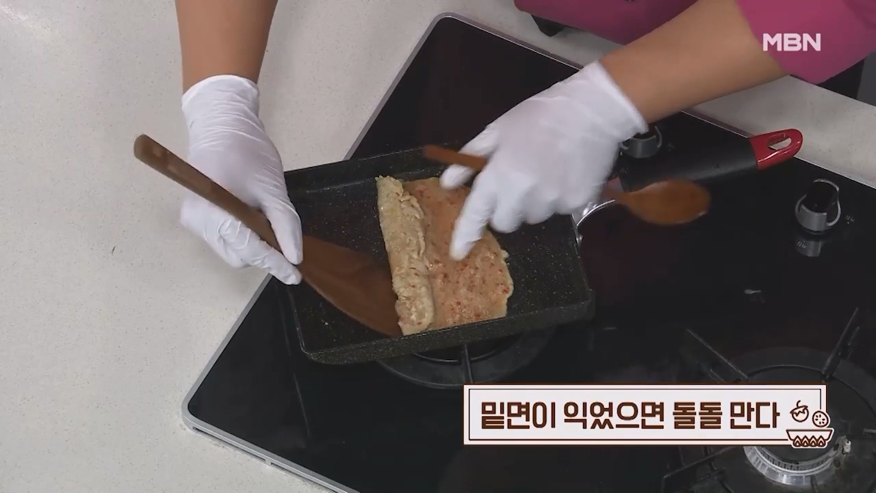 14. 밑면이 익었으면 돌돌 말아줍니다.