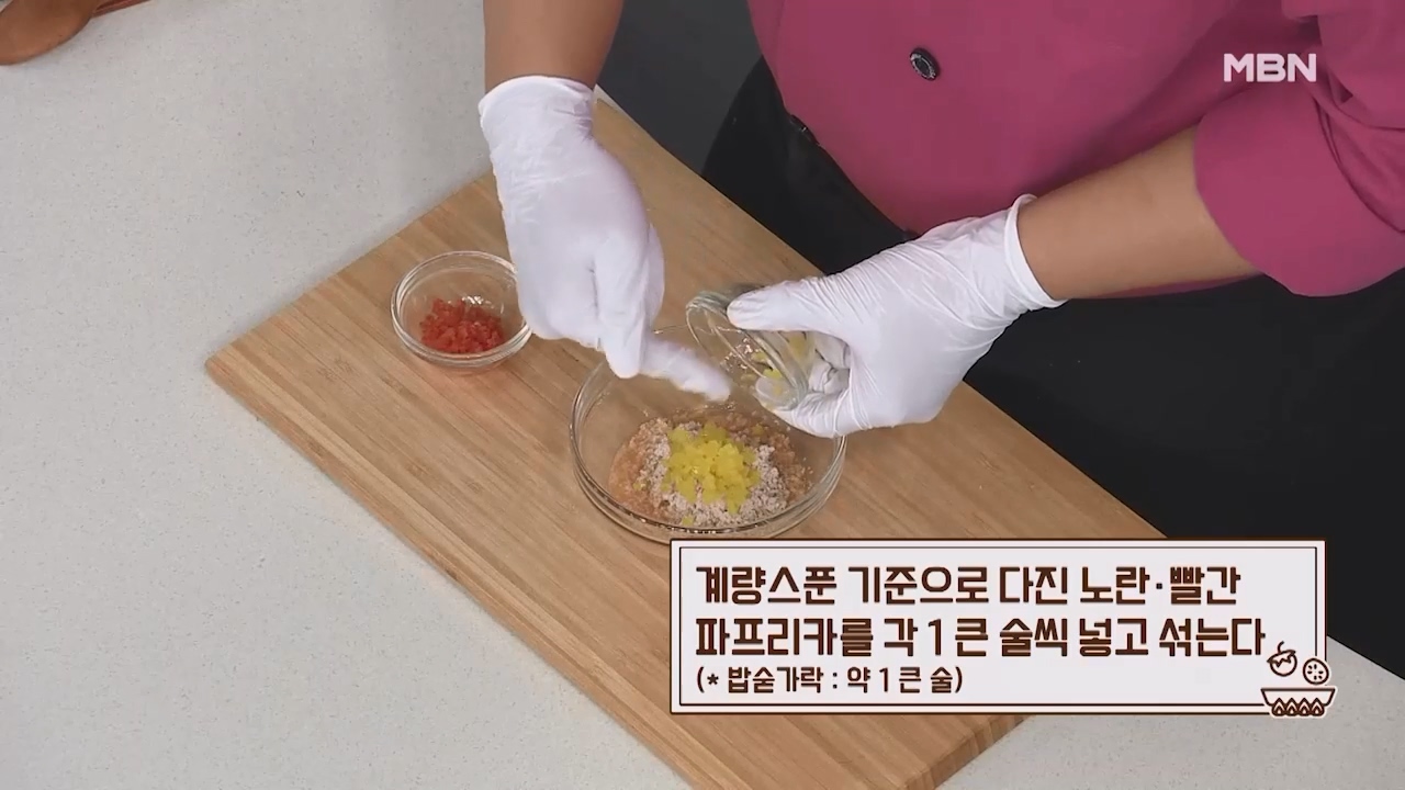 11. 간 돼지고기를 넣은 달걀물에 계량스푼 기준으로 다진 노란 파프리카 1큰술, 다진 빨간 파프리카 1큰술을 넣고 잘 섞어줍니다.