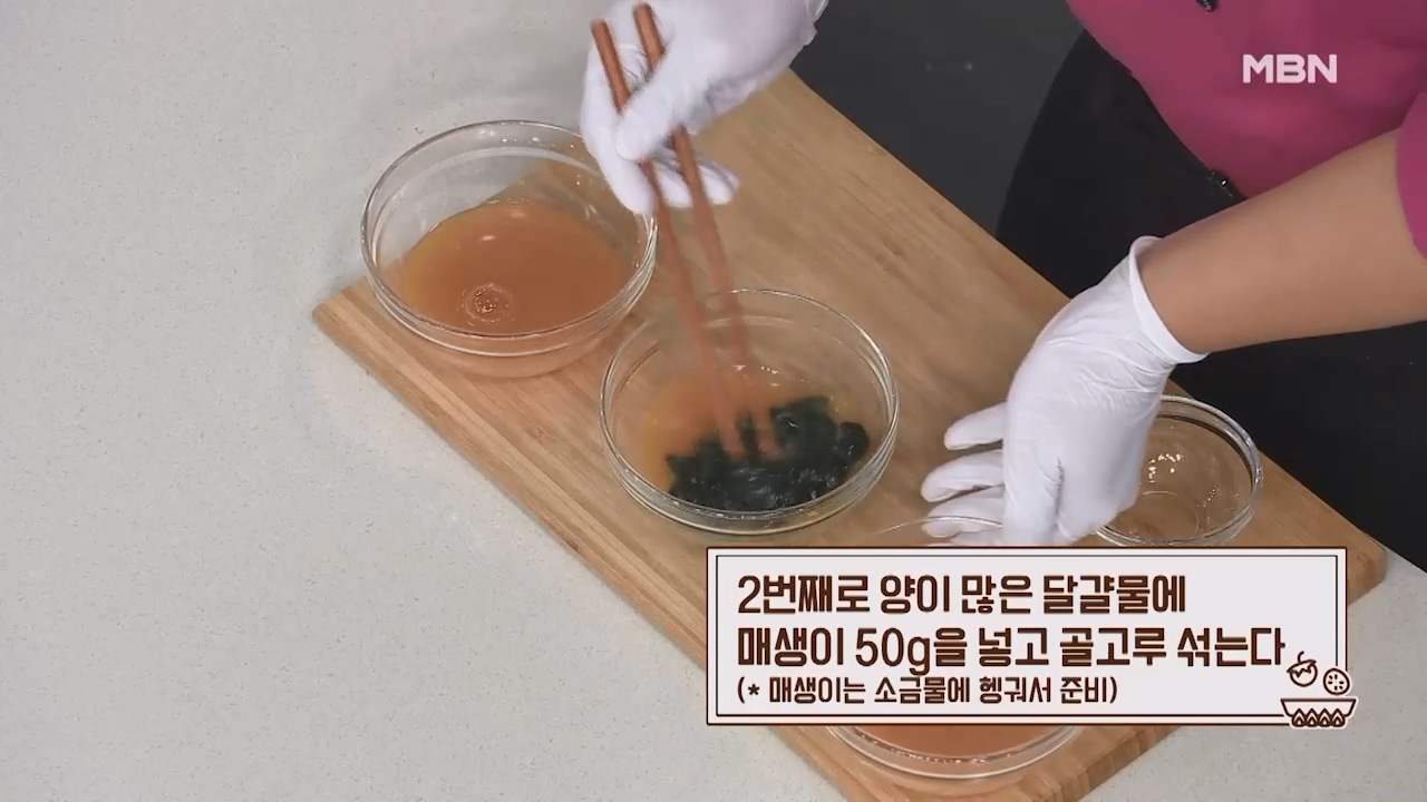 6. 2번째로 양이 많은 달걀물에 소금물에 헹군 매생이 50g을 넣고 골고루 섞어 줍니다.