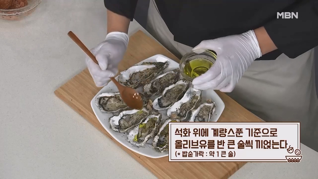 7. 석화 위에 계량스푼 기준으로 올리브유를 반 큰술씩 끼얹습니다. (밥숟가락 약 1큰술)