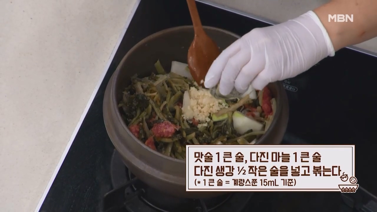 14. 맛술 1큰술, 다진마늘 1큰술, 다진 생강 1/2작은술을 넣고 볶아줍니다. (1큰술은 계량스푼 15mL 기준)