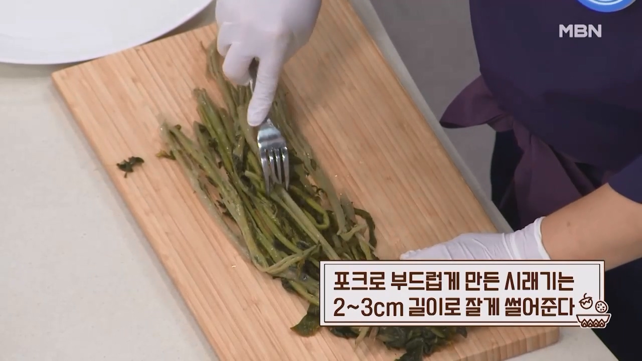 2. 포크로 시래기 줄기 부분을 긁어서 억센 시레기를 부드럽게 만들고 시래기를 2~3cm 길이로 잘게 썰어줍니다. (포크로 시레기 줄기를 긁으면 섬유질이 끓겨서 식감이 부드러워 집니다.)