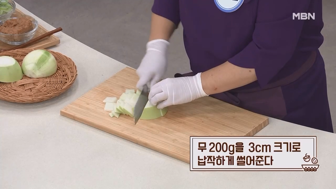 6. 무 200g을 3cm 크기로 납작하게 썰어줍니다.