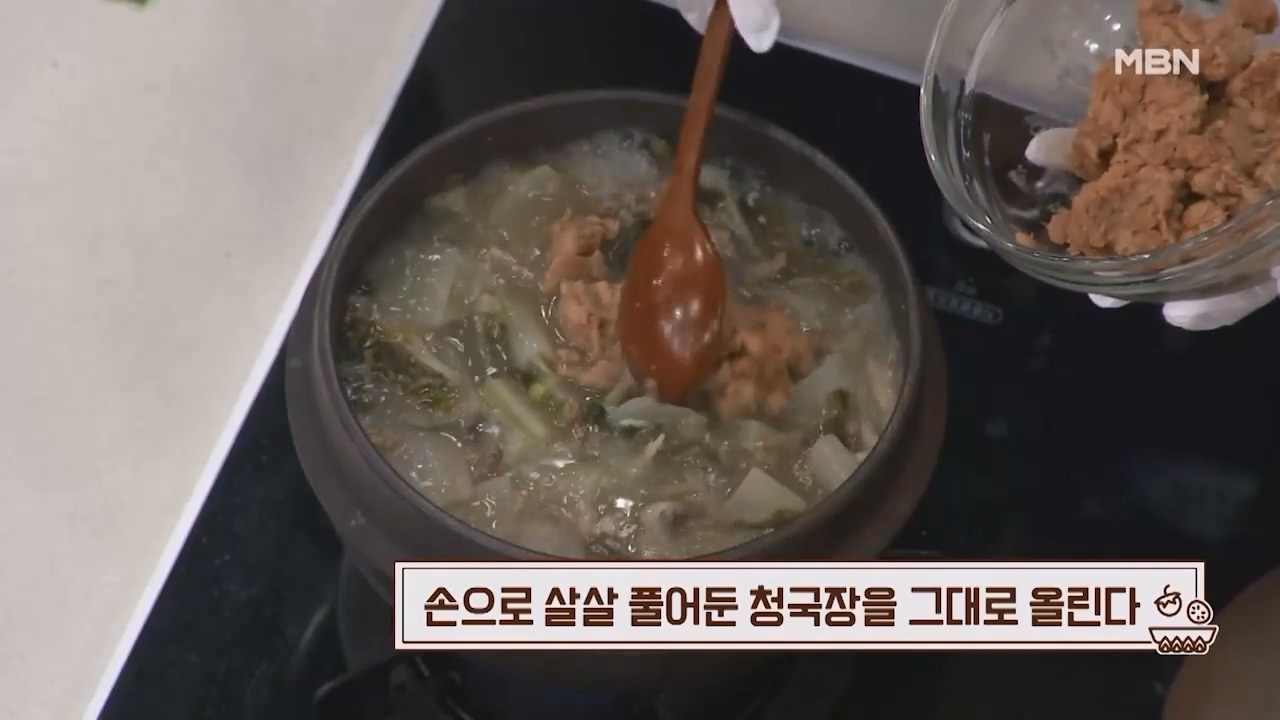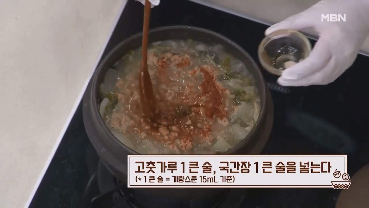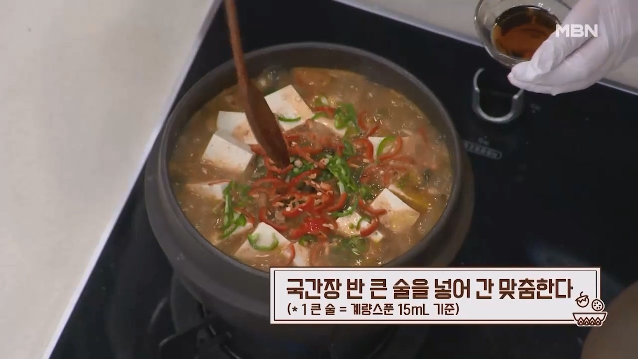 21. 국간장 반큰술을 넣어 간을 맞춰주면 맛있는 시래기 청국장이 완성됩니다. (1큰술은 계량스푼 15mL 기준)