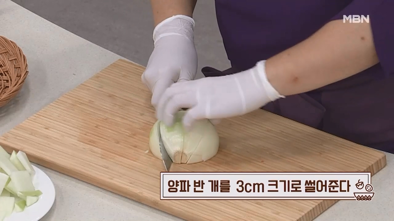 7. 양파 반개를 3cm 크기로 썰어줍니다.