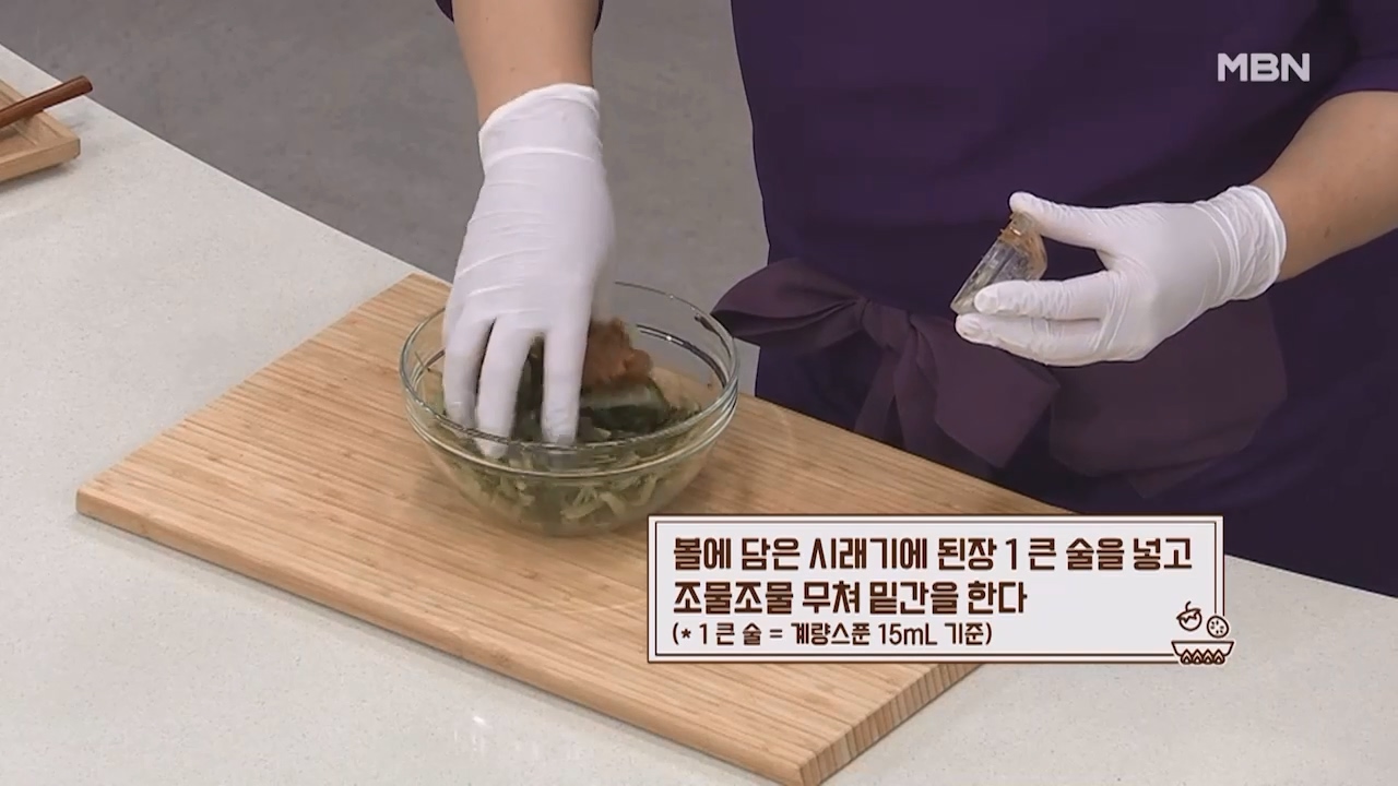 3. 볼에 담은 시래기에 된장 1큰술을 넣고 조물조물 무쳐 밑간을 합니다. (1큰술은 계량스푼 15mL기준)