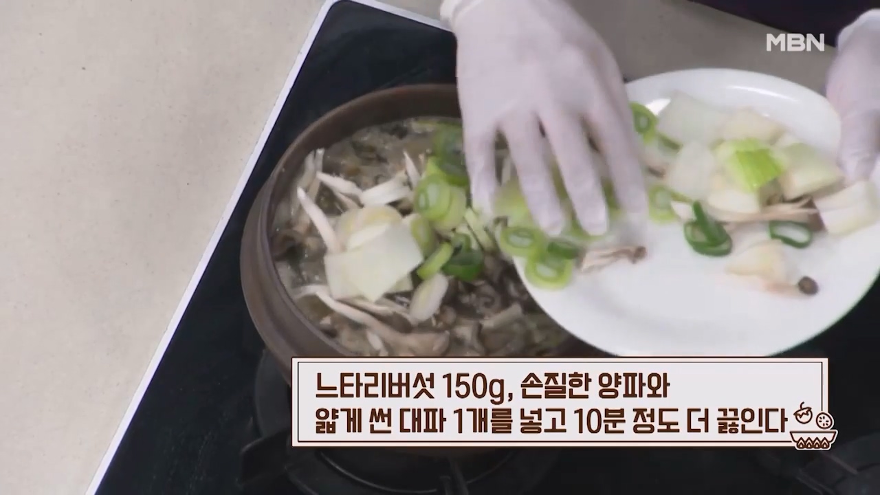 16. 느타리버섯 150g, 손질한 양파와 얇게 썬 대파 1개를 넣고 10분 정도 더 끓여줍니다.