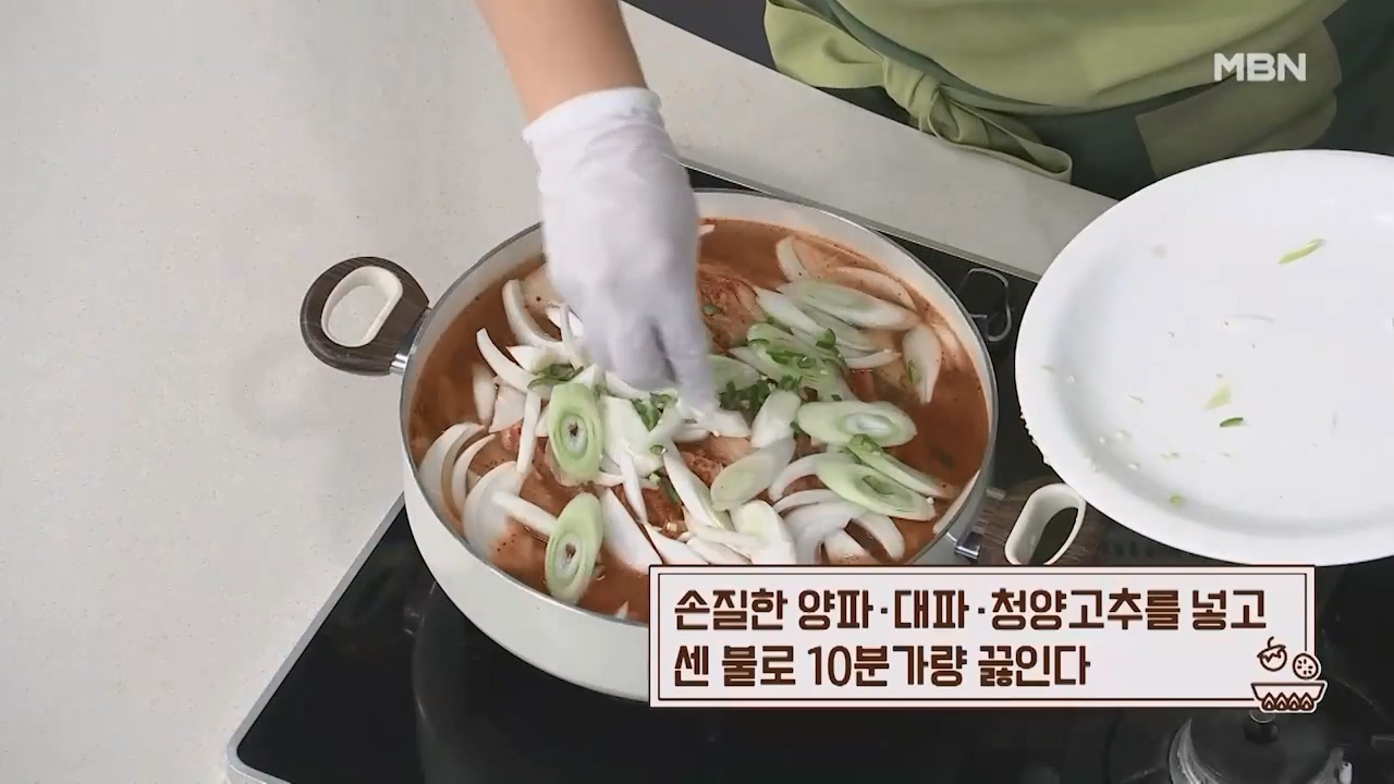 12. 손질한 양파, 대파, 청양고추를 넣고 센불로 10분가량 끓여줍니다.