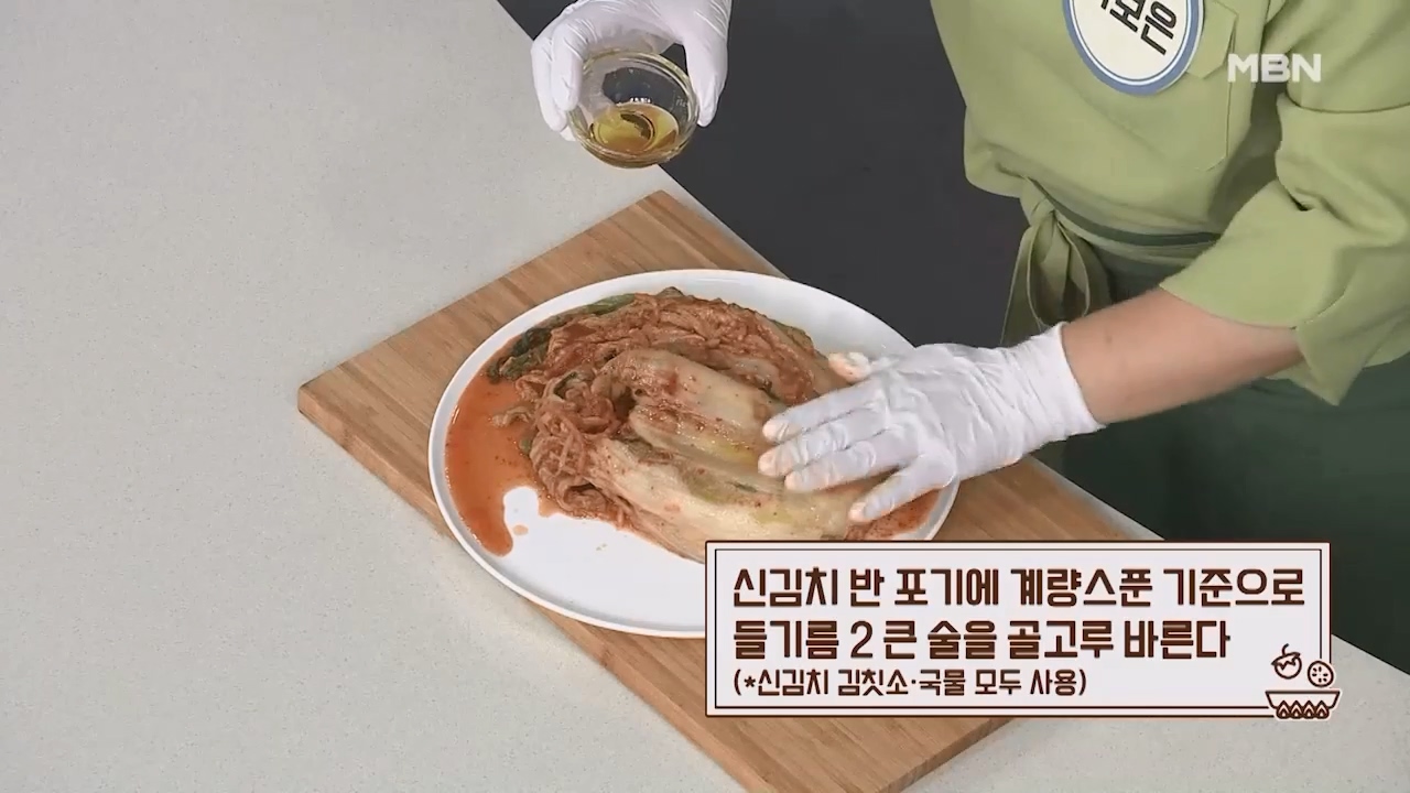 1. 신김치 반포기에 계량스푼 기준으로 들기름 2큰술을 골고루 발라줍니다. (신김치 김칫소와 국물을 모두 사용합니다.)