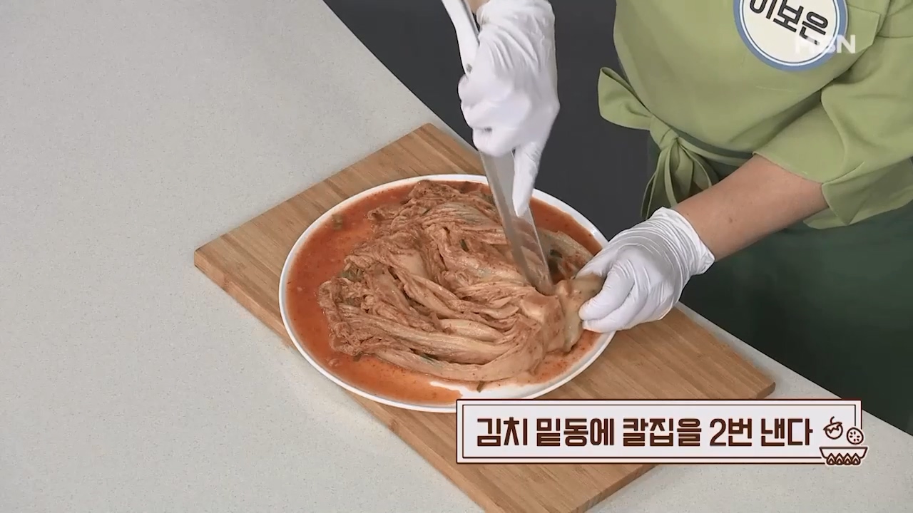 2. 김치 밑동에 칼집을 2번 내줍니다.