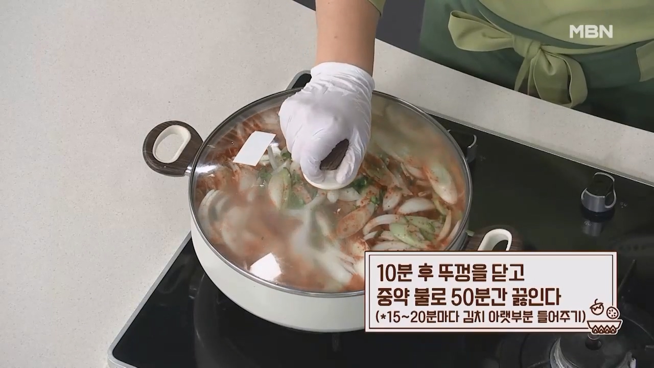 13. 10분 후 뚜껑을 닫고 중약 불로 50분간 끓여주면 맛있고 부드러운 돼지김치찜이 완성됩니다. (15~20분 마다 김치 아랫부분이 타지 않도록 들어줍니다)