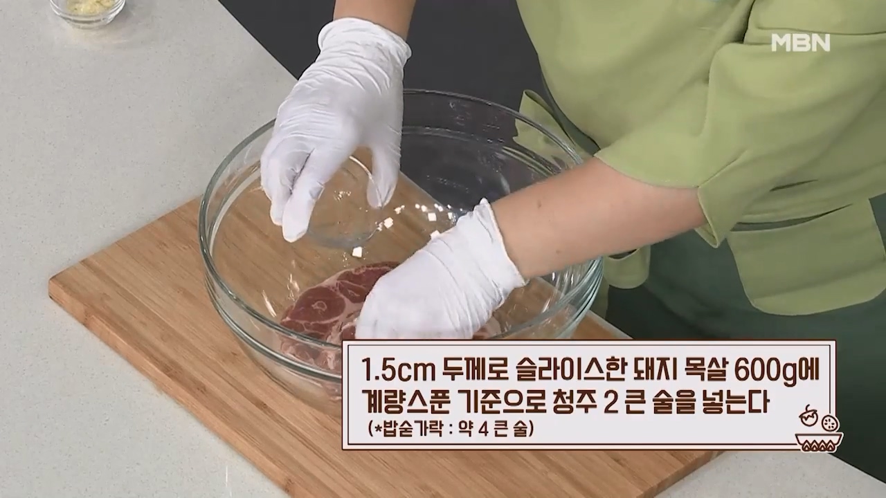 3. 1.5cm 두께로 슬라이스한 돼지 목살 600g에 계량스푼 기준으로 청주 2큰술을 넣습니다. (밥숟가락 약 4큰술)