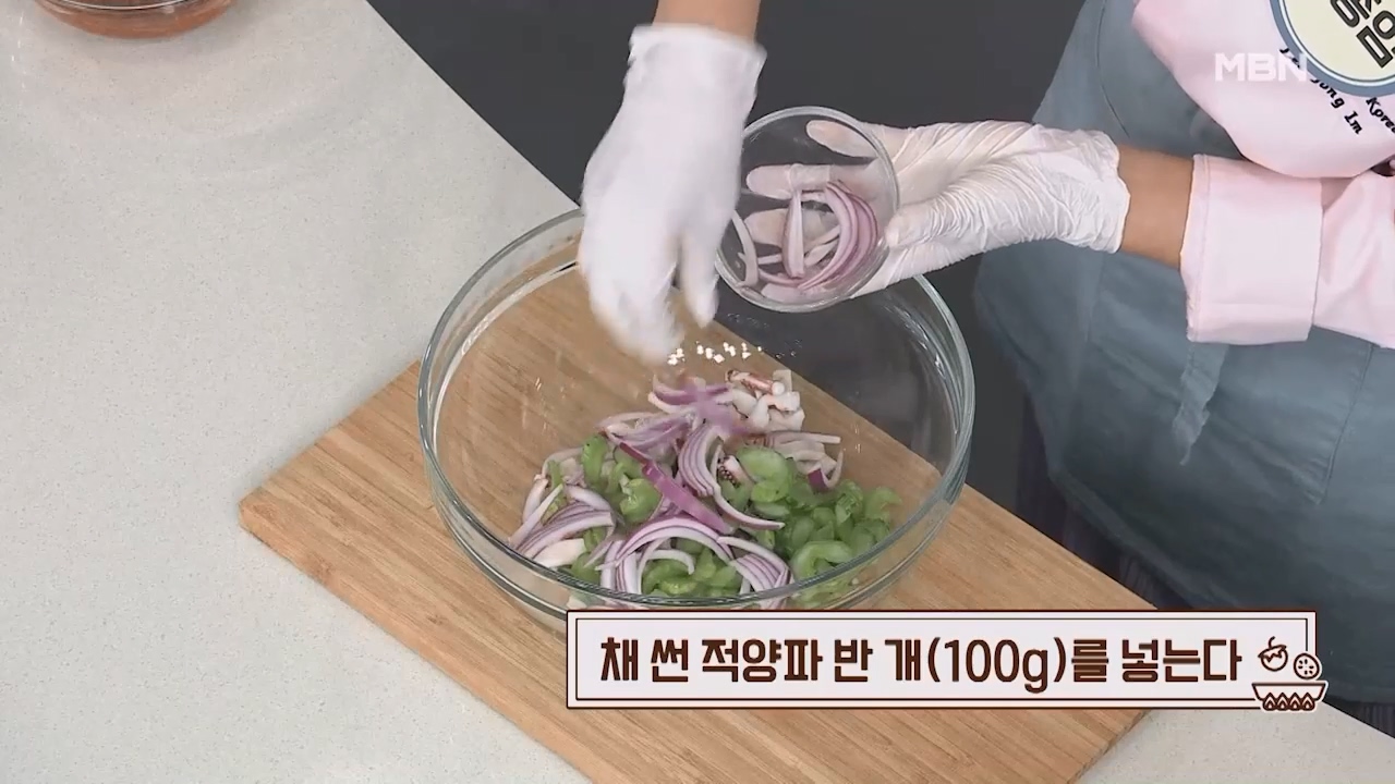 17. 채 썬 적양파 반개(100g)를 넣습니다.