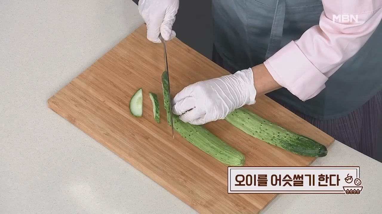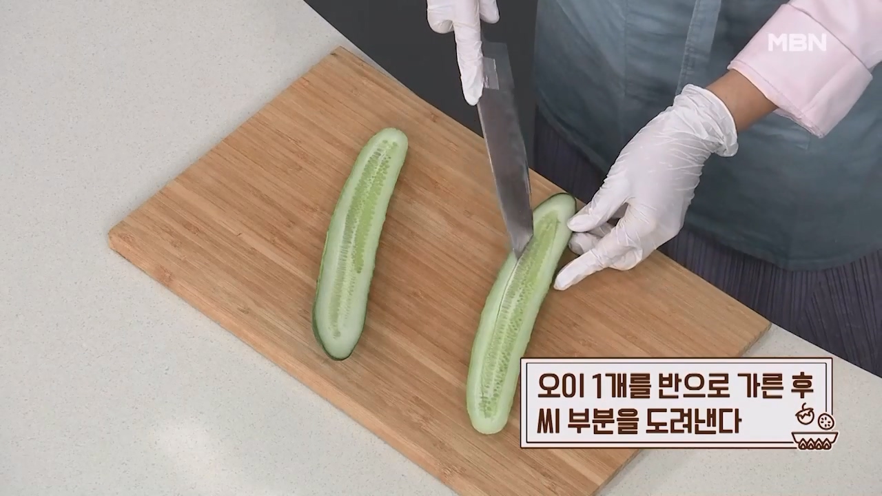 5. 오이 1개를 반으로 가른 후 씨 부분을 도려내 제거합니다.