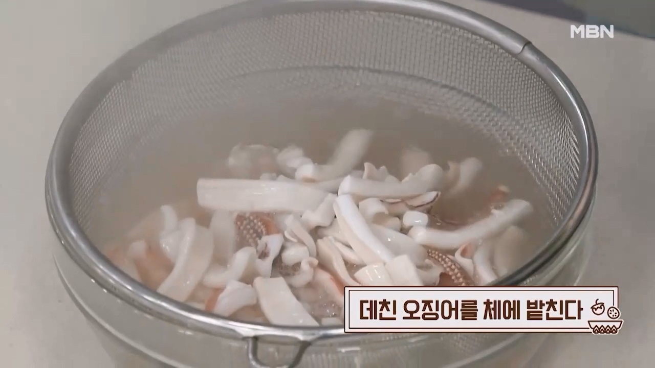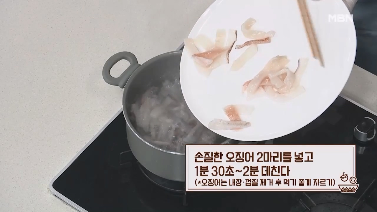 3. 손질한 오징어 2마리를 넣고 1분 30초 ~2분 데쳐줍니다. (오징어는 내장과 껍질을 제거하고 먹기 좋게 잘라서 손질합니다.)