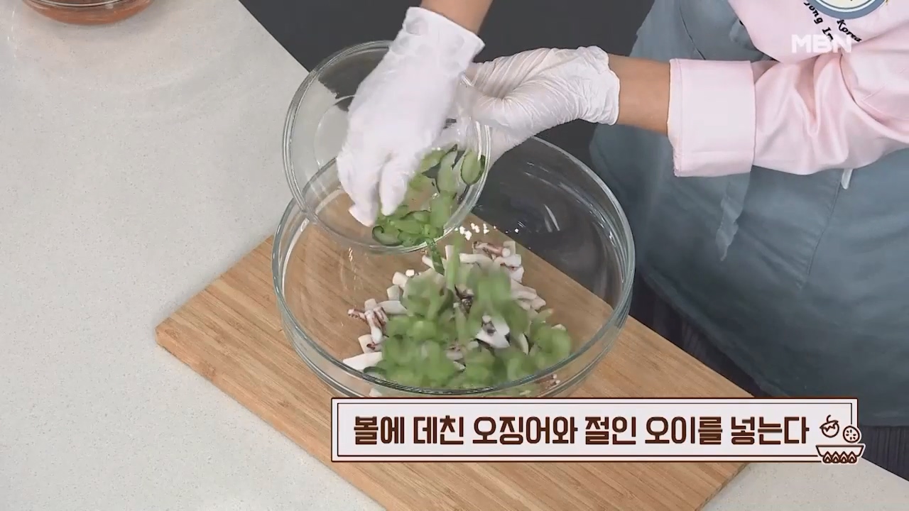 16. 볼에 데친 오징어와 절인 오이를 넣어줍니다.