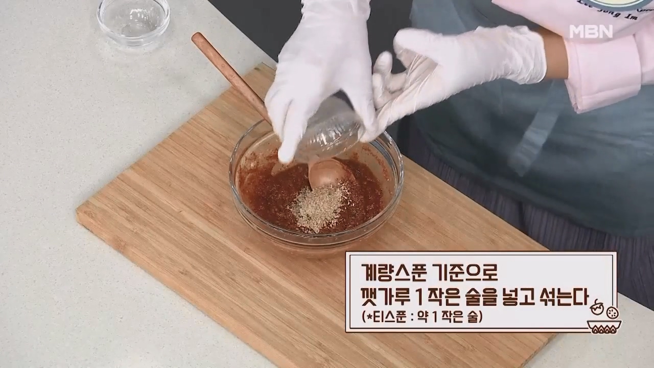 15. 계량스푼 기준으로 깻가루 1작은술을 넣고 잘 섞어줍니다. (티스푼 약 1작은술)
