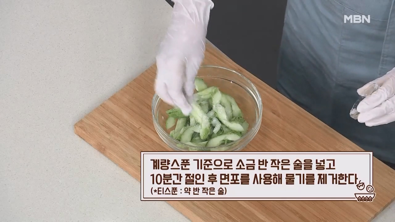 7. 계량스푼 기준으로 소금 반 작은술을 넣고 10분간 절인 후 면포를 사용해 물기를 제거합니다. (티스푼 약 반 작은술)