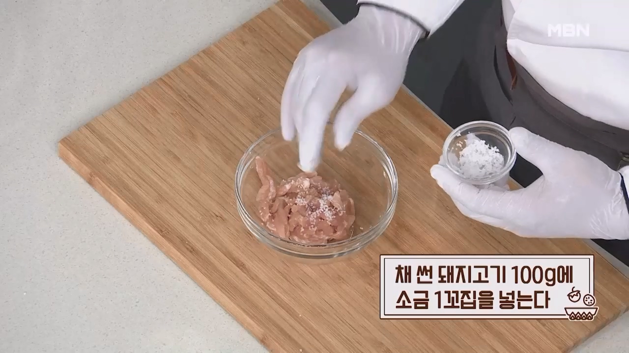 4. 채 썬 돼지고기 100g에 소금 1꼬집을 넣습니다.