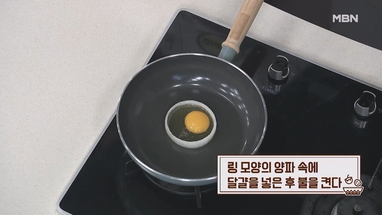 11. 링 모양의 양파 속에 달걀을 넣은 후 불을 켭니다.