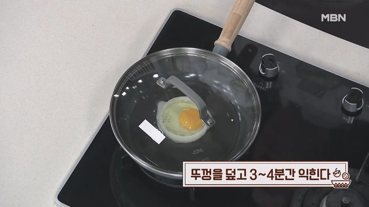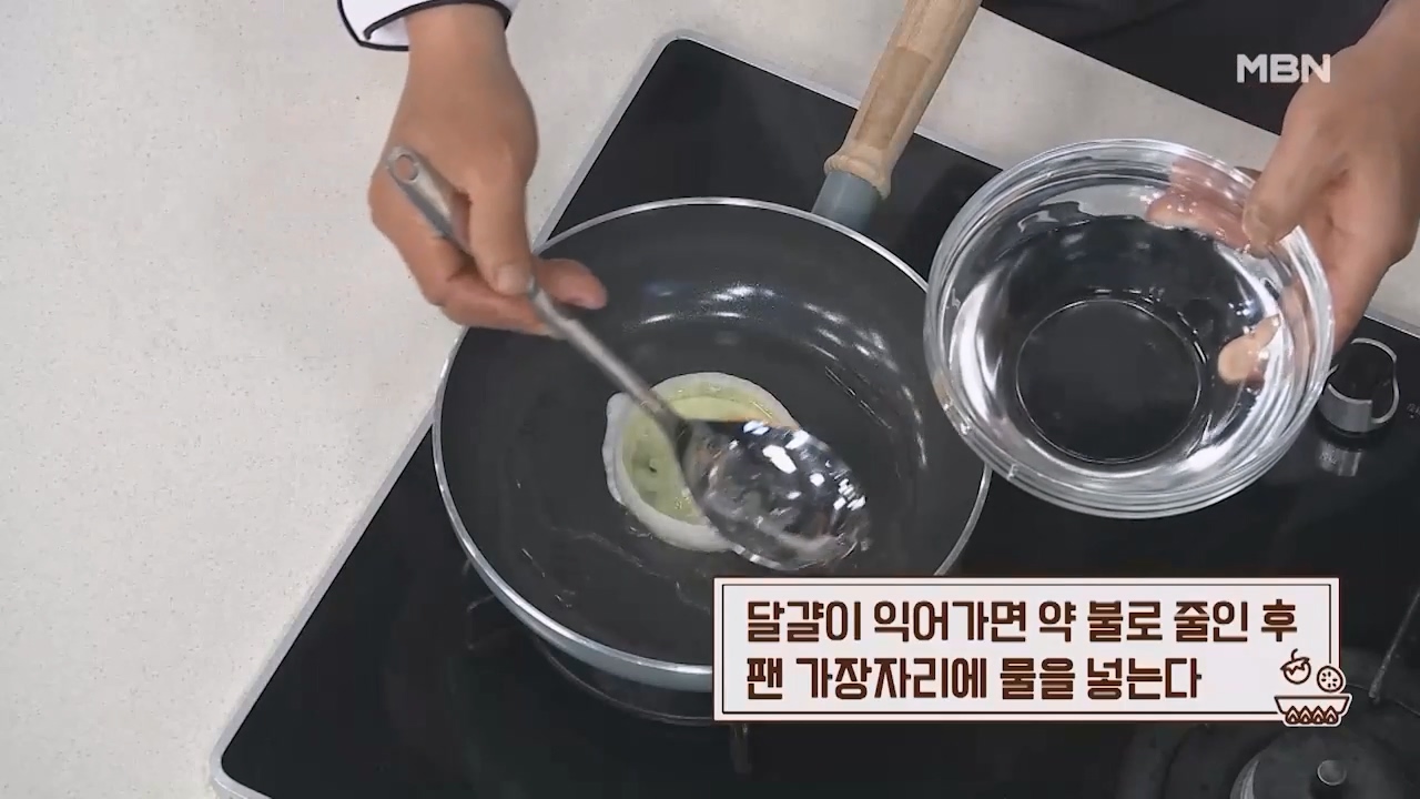 12. 달걀이 익어가면 약불로 줄인 후 팬 가장자리에 물을 넣습니다.