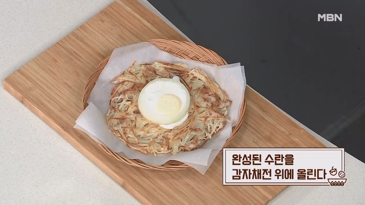 14. 완성된 수란을 감자채전 위에 올리면 맛있는 감자채전이 완성됩니다.