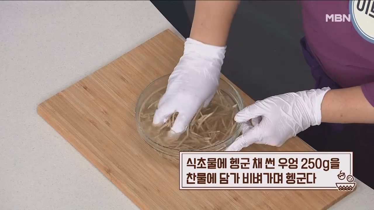1. 식초물에 헹군 채 썬 우엉 250g을 찬물에 담가 비벼가며 헹굽니다.