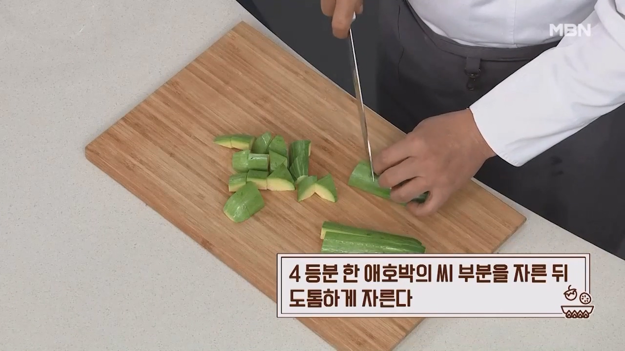 2. 4등분 한 애호박의 씨 부분을 자른 뒤 도톰하게 잘라줍니다.