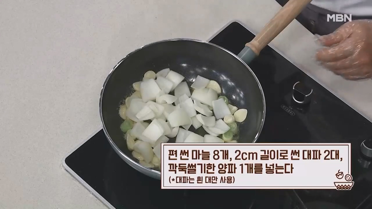7. 편 썬 마늘 8개, 2cm 길이로 썬 대파 흰대 2대, 깍둑썰기한 양파 1개를 넣습니다. (대파는 흰대만 사용)