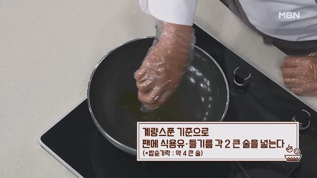 6. 계량스푼 기준으로 팬에 식용유 2큰술, 들기름 2큰술을 넣습니다. (밥숟가락 약 4큰술)