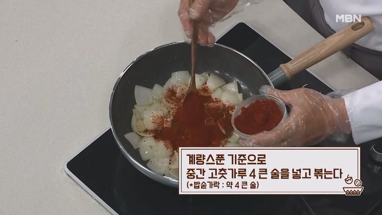 9. 계량스푼 기준으로 중간 고춧가루 4큰술을 넣고 볶아줍니다. (밥숟가락 약 4큰술)