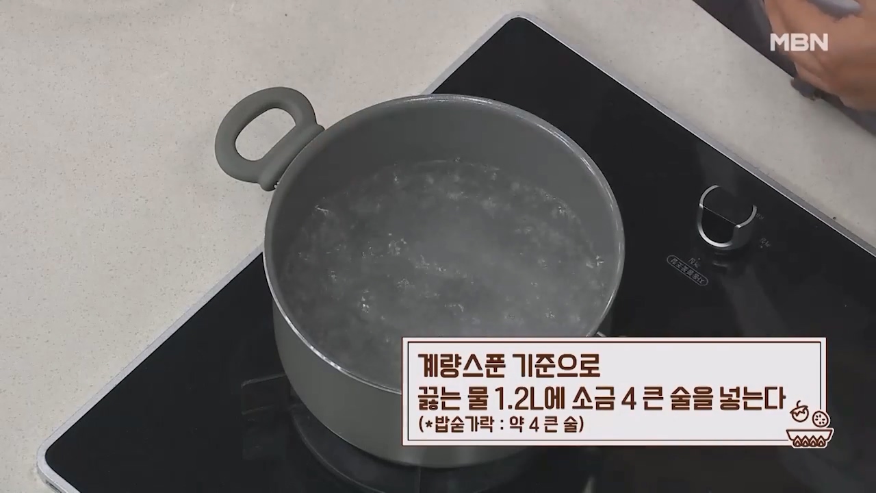 3. 계량스푼 기준으로 끓는 물 1.2리터에 소금 4큰술을 넣습니다. (밥숟가락 약 4큰술)