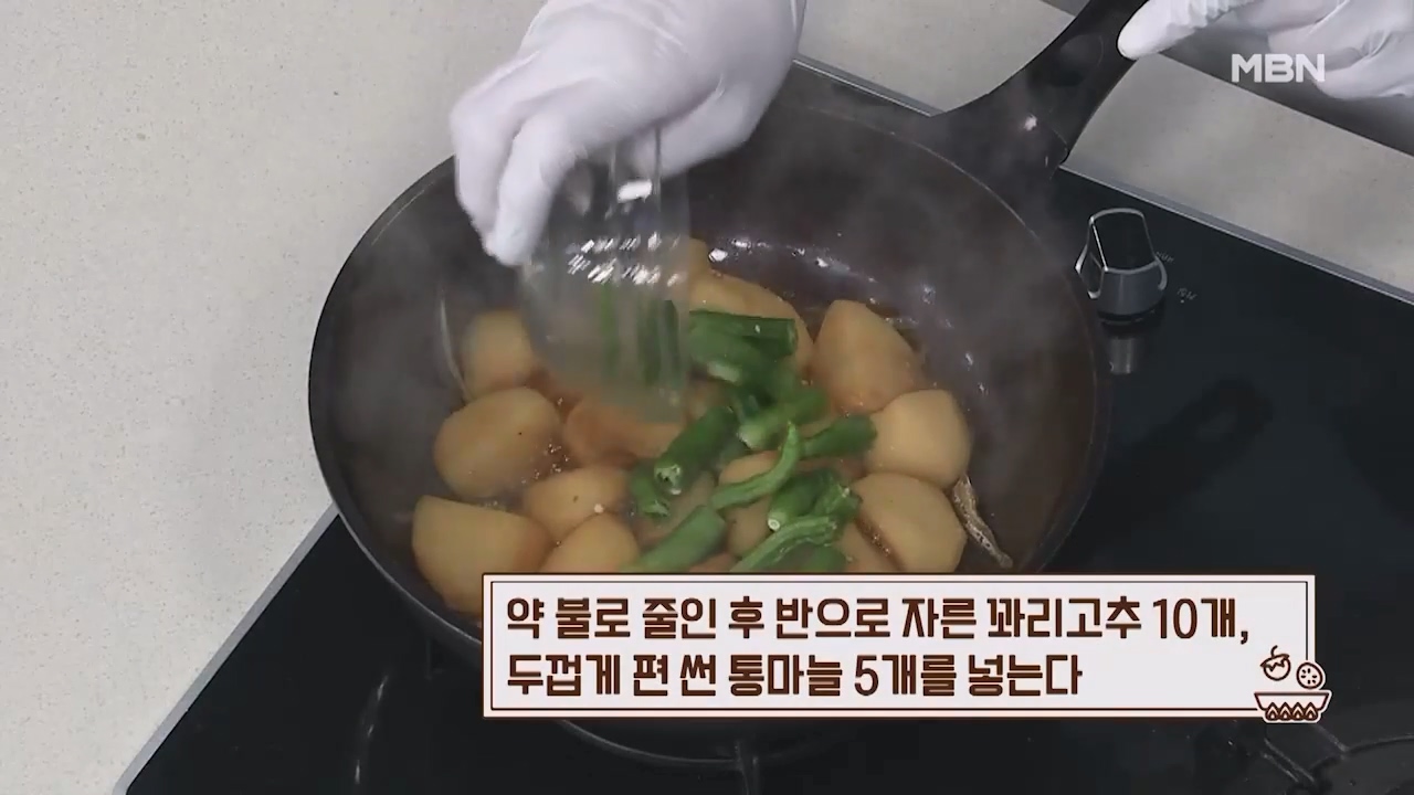 7. 약불로 줄인 후 반으로 자른 꽈리고추 10개, 두껍게 편 썬 통마늘 5개를 넣어줍니다.