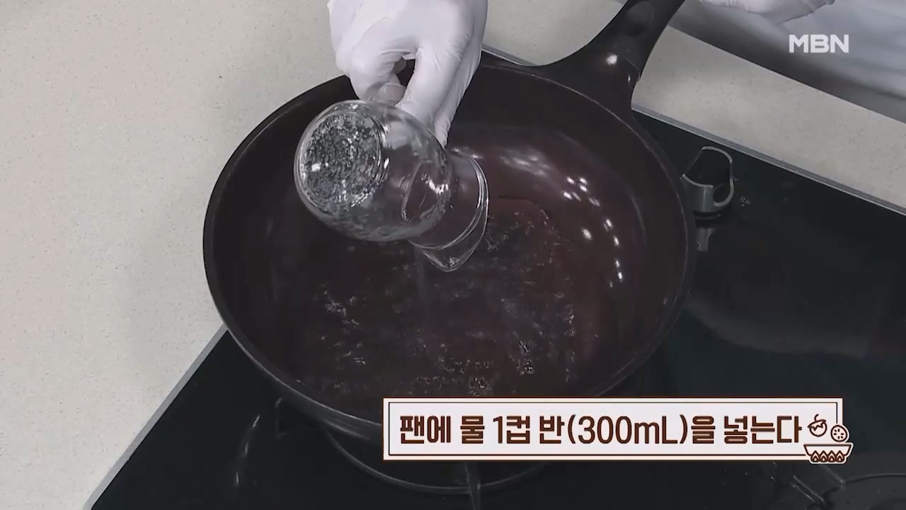 2. 팬에 물 1컵 반 (300mL)을 넣습니다.