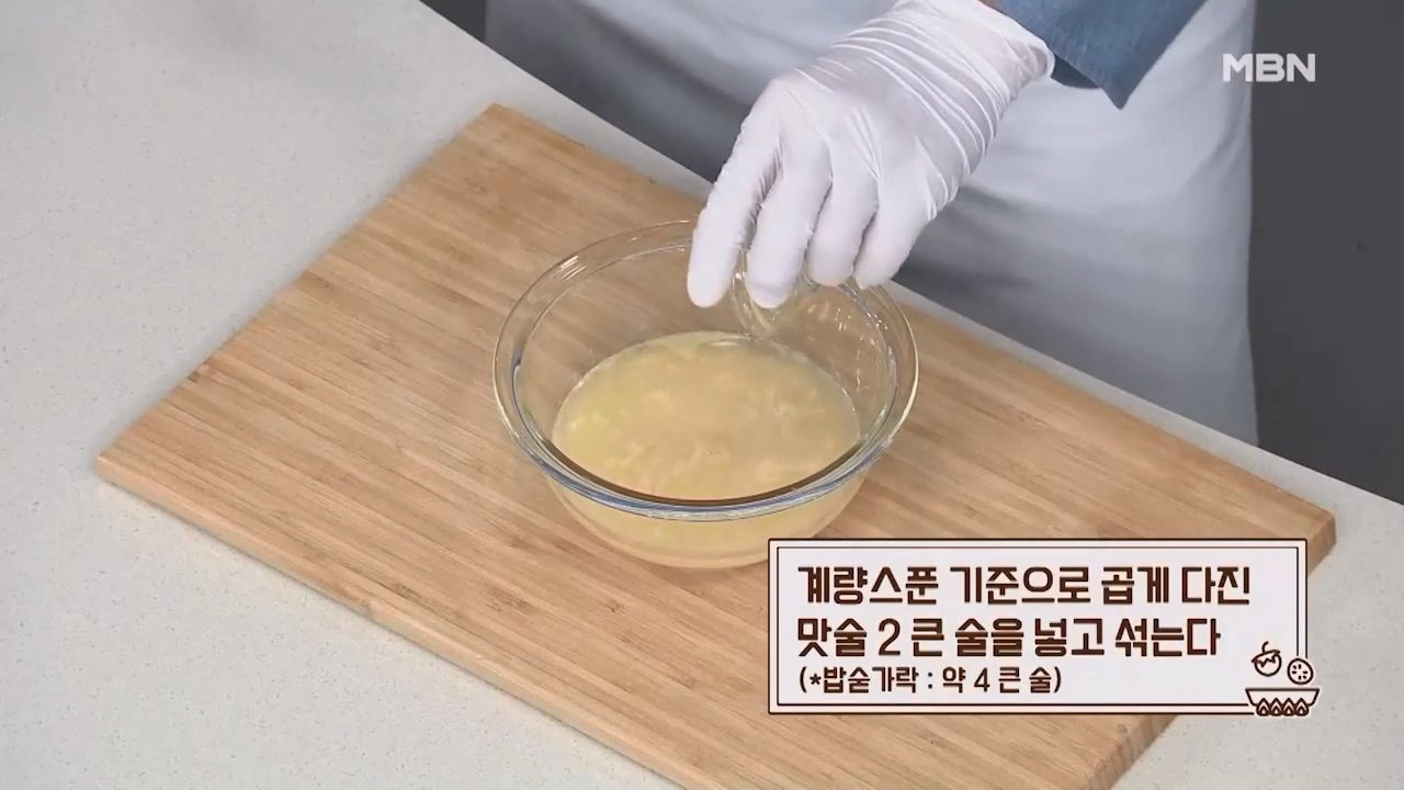 4. 계량스푼 기준으로 곱게 다진 맛술 2큰술을 넣고 섞어줍니다. (밥숟가락 약 4큰술)
