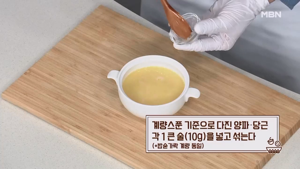 6. 계량스푼 기준으로 다진 양파 1큰술(10g), 당근 1큰술 (10g)을 넣고 잘 섞어줍니다. (밥숟가락 계량 동일)