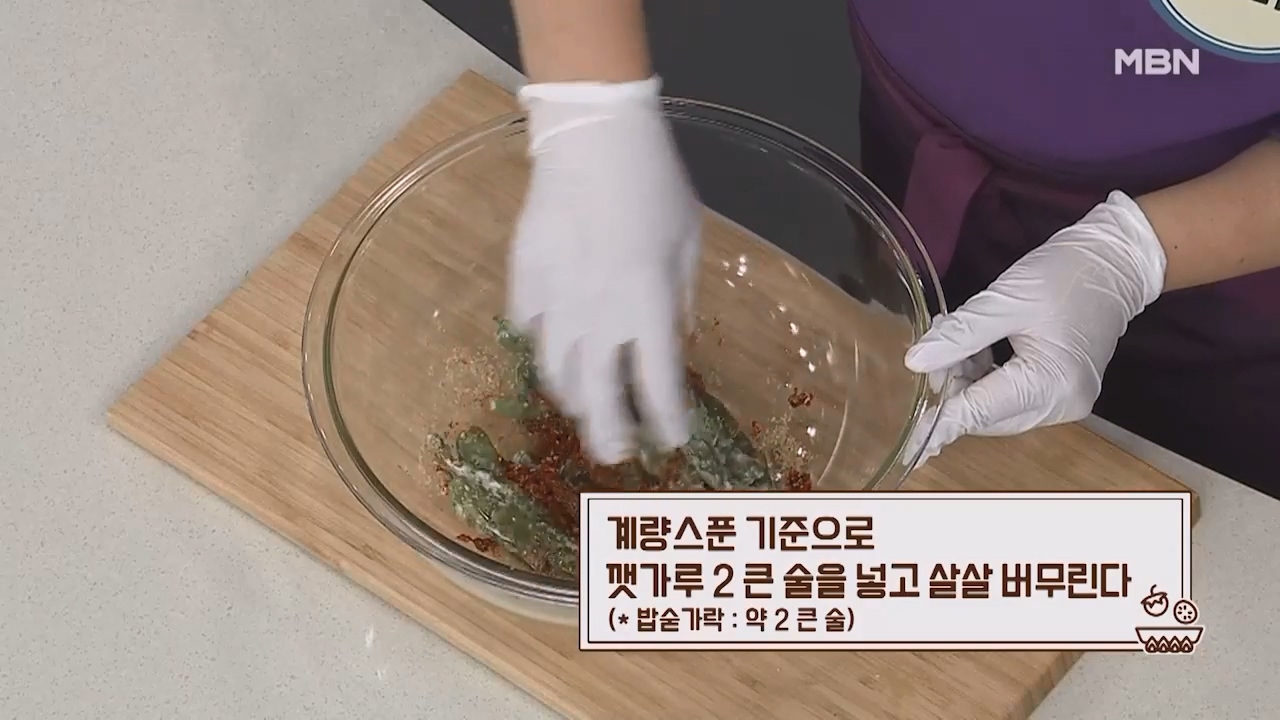 14. 계량스푼 기준으로 깻가루 2큰술을 넣고 살살 버무립니다. (밥숟가락 약 2큰술)