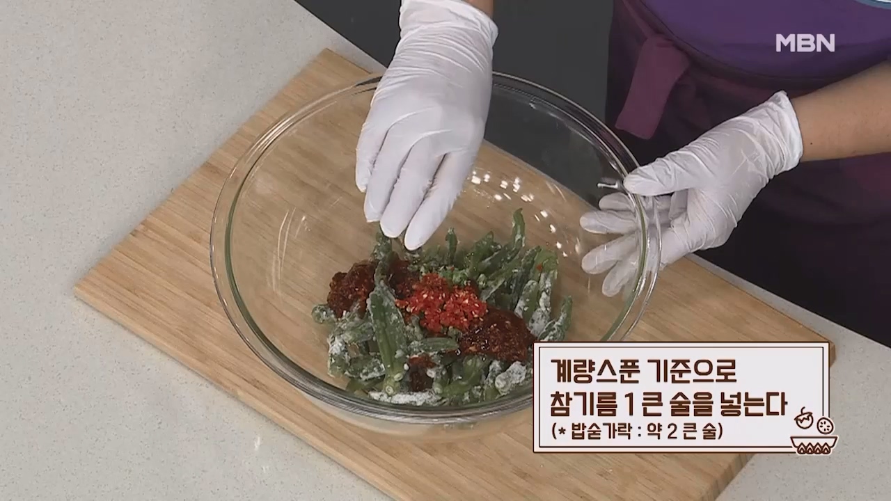 14. 계량스푼 기준으로 깻가루 2큰술을 넣고 살살 버무립니다. (밥숟가락 약 2큰술)