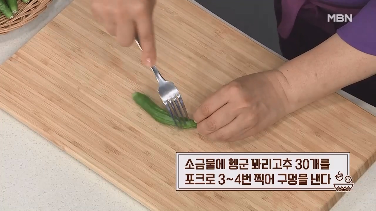1. 소금물에 헹군 꽈리고추 30개를 포크로 3~4번 찍어 구멍을 냅니다.